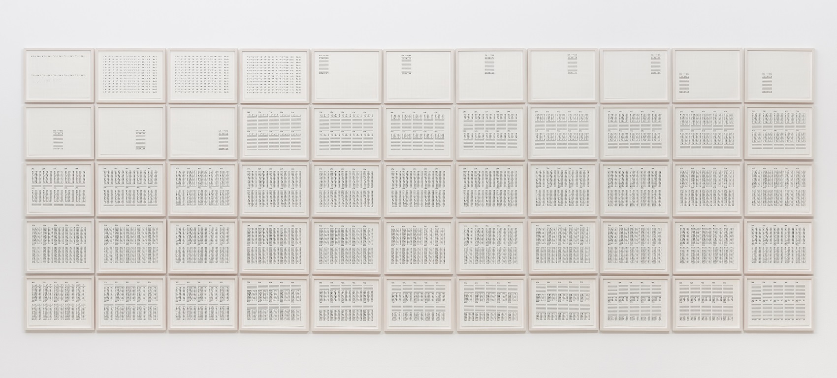 Hanne Darboven, „Konstruktionen”, 1968, tusz na papierze, 55 rysunków (każdy 20,3 x 27,3 cm), Kolekcja Grażyny Kulczyk (źródło: materiały prasowe organizatora)