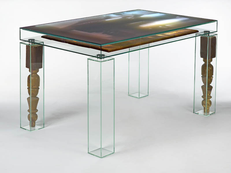 Agnieszka Lasota, Stół z cyklu „Meble z pamięcią”, 2008, 102 x 162 x 92,5 cm. Fot. G-M Studio. Stół dębowy, szkło Priva Lite, szkło hartowane, rzutnik, notebook PC, transformator.