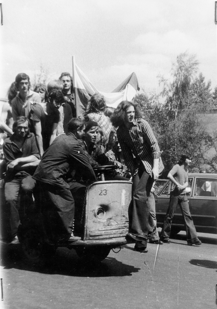 Robotnicy jadący przed budynek KW PZPR. Podpis pod zdjęciem głosi, że mężczyzna prowadzący pojazd to główny prowodyr zajścia – osoba kierująca całą grupą, 25 czerwca 1976, Radom, fot. NN, zbiory Ośrodka KARTA, materiały udostępnione przez Muzeum Historii Polski w Krakowie