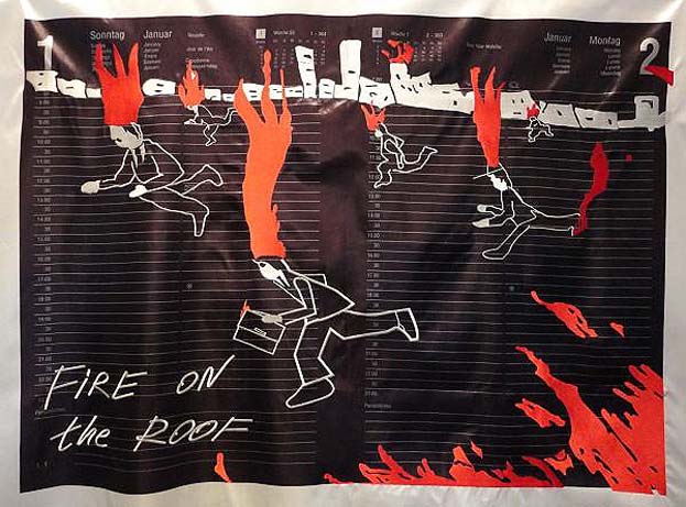 Volodymyr Kuznetsov, „Pożar na dachu” z cyklu Pamiętnik, 2011, 102 x 165 cm, haft i druk na tkaninie