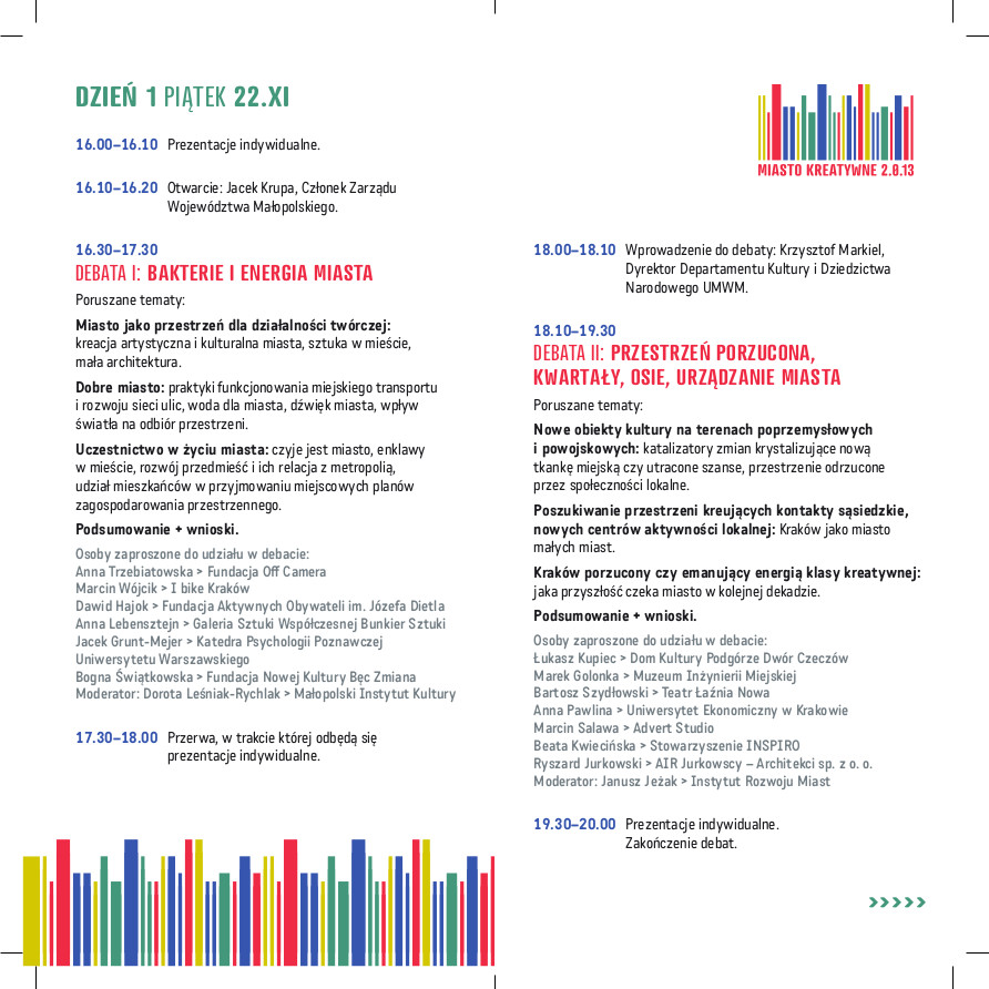 Miasto kreatywne. Debaty, spotkania i warsztaty w Krakowie ← Poprzedni Następny → „Miasto kreatywne. Znaczenie i naznaczanie przestrzeni” plakat (źródło: materiały prasowe organizatora) „Miasto kreatywne. Znaczenie i naznaczanie przestrzeni” debata w Muzeum Inżynierii Miejskiej w Krakowie, ulotka (źródło: materiały prasowe) „Miasto kreatywne. Znaczenie i naznaczanie przestrzeni” debata w Muzeum Inżynierii Miejskiej w Krakowie, ulotka (źródło: materiały prasowe)