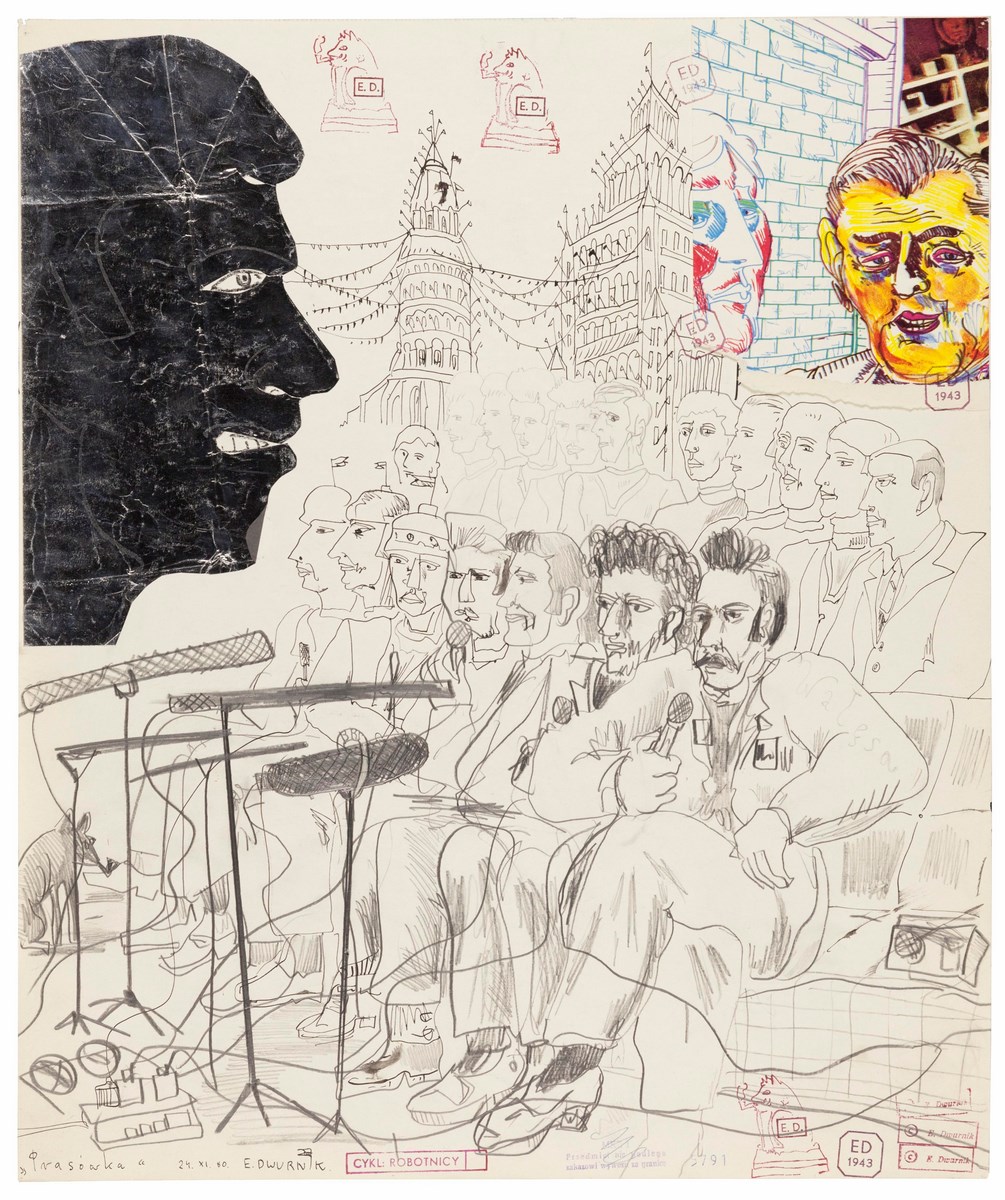Edward Dwurnik, „Prasówka”, z cyklu „Robotnicy”, 1980, technika mieszana, 58,4 x 48,9 cm, dzięki uprzejmości artysty (źródło: materiały prasowe organizatora)
