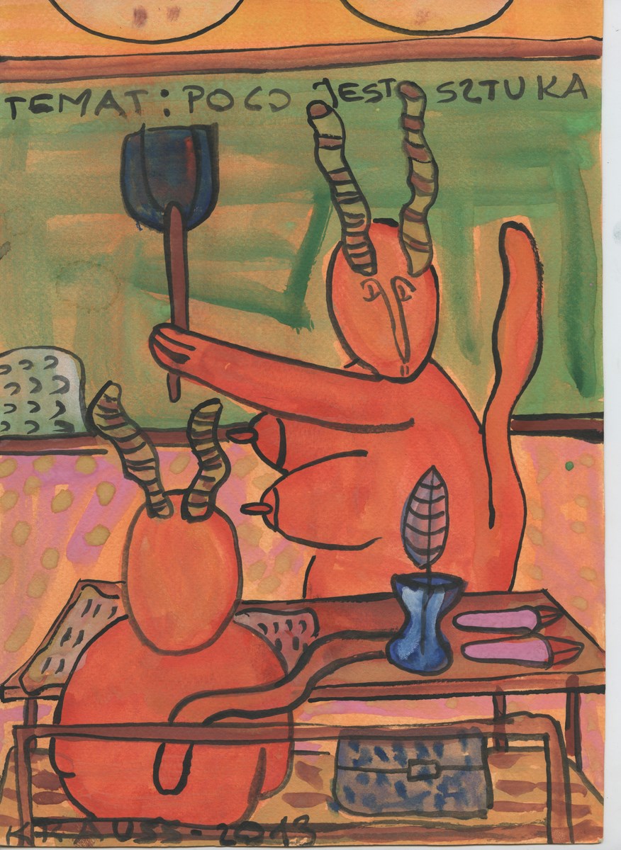 Marek Krauss, „Szkoła”, z cyklu „Po co jest sztuka, życie rodzinne”, 2013, gwasz / karton, 29,7 x 21 cm, Kolekcja MOCAK-u (źródło: materiały prasowe organizatora)