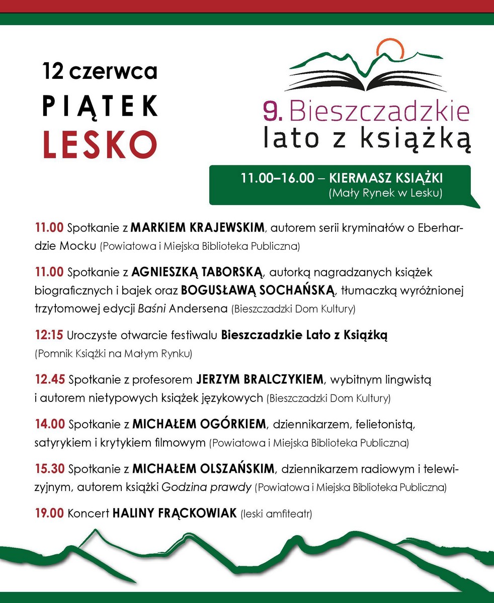 Bieszczadzkie Lato z Książką w pięciu miastach ← Poprzedni Następny → Bieszczadzkie Lato z Książką w Lesku – plakat (źródło: materiały prasowe) Bieszczadzkie Lato z Książką w Rzeszowie – plakat (źródło: materiały prasowe organizatora) Bieszczadzkie Lato z Książką w Lesku – plakat (źródło: materiały prasowe organizatora) Bieszczadzkie Lato z Książką w Przemyślu – plakat (źródło: materiały prasowe organizatora) Bieszczadzkie Lato z Książką w Sanoku – plakat (źródło: materiały prasowe organizatora)