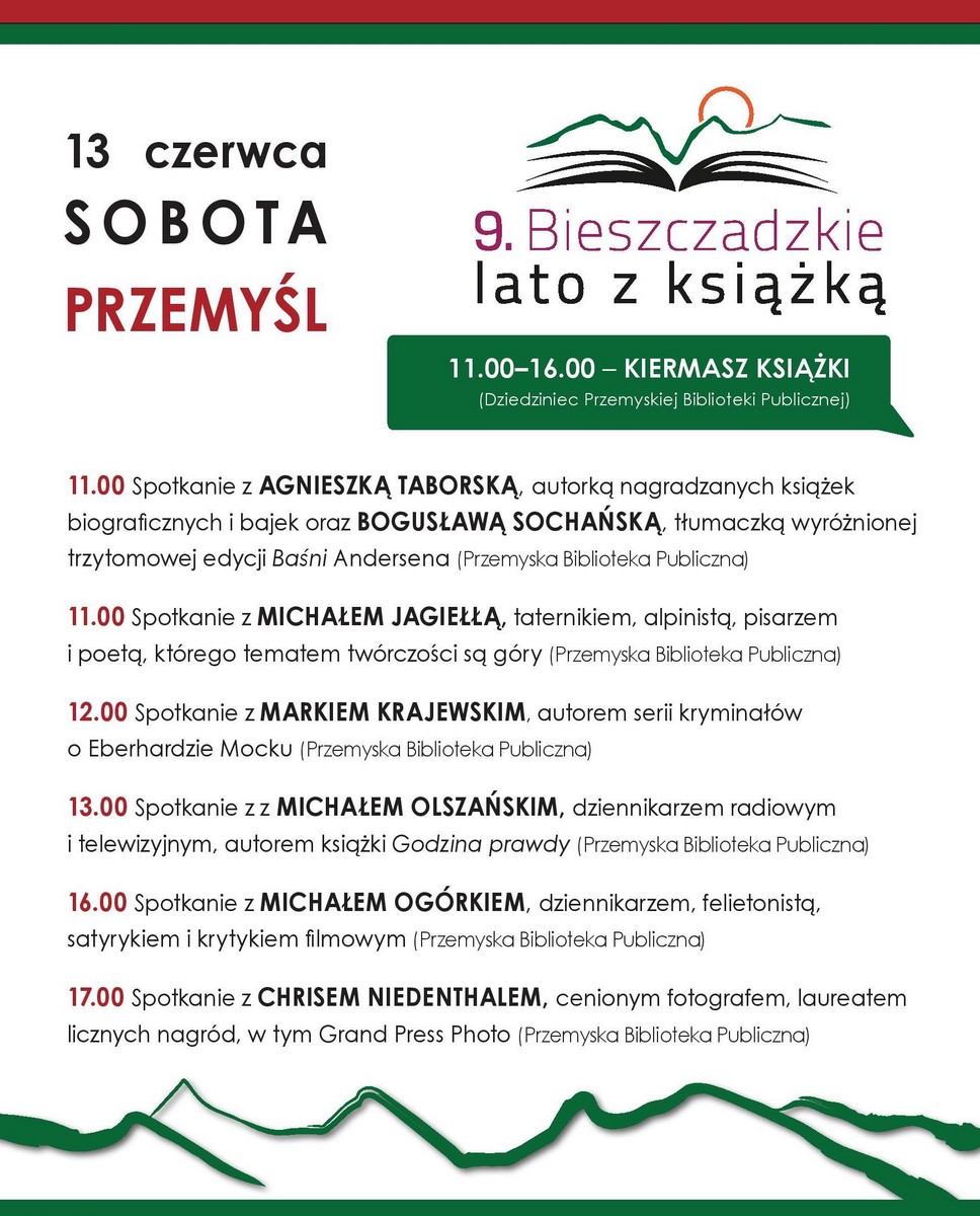 Bieszczadzkie Lato z Książką w pięciu miastach ← Poprzedni Następny → Bieszczadzkie Lato z Książką w Przemyślu – plakat (źródło: materiały prasowe) Bieszczadzkie Lato z Książką w Rzeszowie – plakat (źródło: materiały prasowe organizatora) Bieszczadzkie Lato z Książką w Lesku – plakat (źródło: materiały prasowe organizatora) Bieszczadzkie Lato z Książką w Przemyślu – plakat (źródło: materiały prasowe organizatora) Bieszczadzkie Lato z Książką w Sanoku – plakat (źródło: materiały prasowe organizatora)