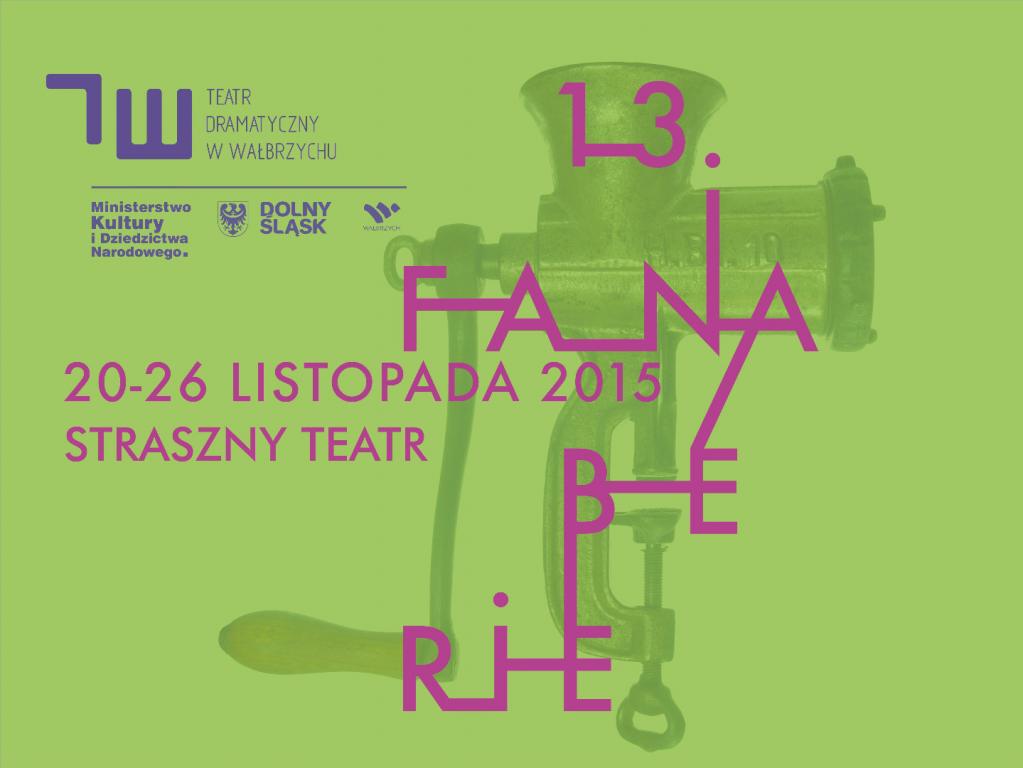 Fanaberie teatralne Następny → Wałbrzyskie Fanaberie Teatralne – plakat (źródło: materiały organizatora) Wałbrzyskie Fanaberie Teatralne – plakat (źródło: materiały organizatora) „Wij”, reż. Łukasz Kos, fot. Maciej Stobierski (źródło: materiały organizatora) Grupa Atamasfera (źródło: materiały organizatora) „Karskiego historia nieprawdziwa”, reż. Julia Mark, fot. Magda Kępińska (źródło: materiały organizatora) „Wieszcze niespokojne”, fot. Joanna Gałuszka (źródło: materiały organizatora) „Pelcia, czyli jak żyć żeby nie odnieść sukcesu”, reż. Joanna Szczepkowska, fot. Klaudyna Schubert (źródło: materiały organizatora) „Od przodu i od tyłu”, reż. Stanisław Miedziewski, fot. Marcin Pietrusza (źródło: materiały organizatora) „Lekcja”, reż. Katarzyna Michalkiewicz, fot. Anna Włoch (źródło: materiały organizatora) „Kali babki”, reż. Michał Siegoczyński, fot. Izabela Rogowska „Dr@cula. Vagina dentata”, reż. Agata Bizuk, fot. Monika Lisiecka (źródło: materiały organizatora) „Droga śliska od traw. Jak to diabeł wsią się przeszedł”, reż. Paweł Wolak, Katarzyna Dworak, fot. Karol Budrewicz (źródło: materiały organizatora)