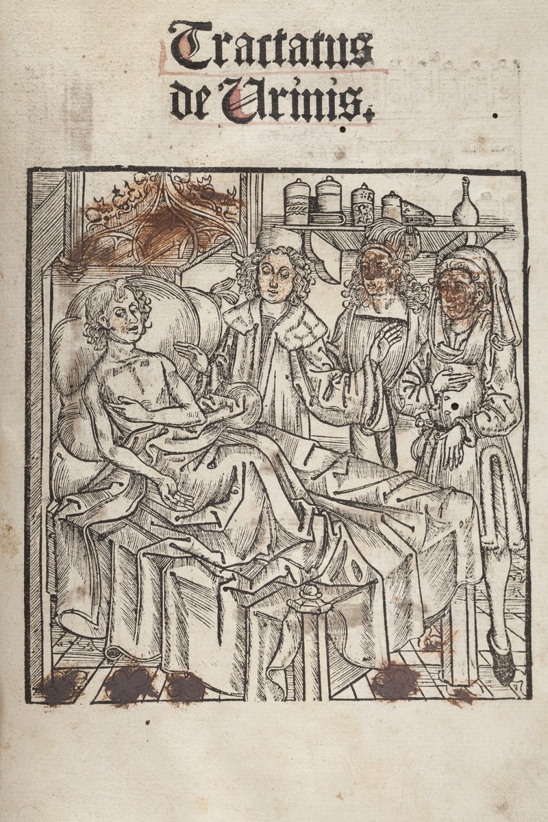 Karta tytułowa „Traktatu o urynie”, z drzeworytem przedstawiającym chorego w otoczeniu medyków. Traktat umieszczony został na końcu przedstawianego dzieła dotyczącego wiedzy zielarskiej i medycznej w języku łacińskim, wydanego w Strasburgu przez Johanna Prüssa około 1507 r. fot. Muzeum Narodowe w Krakowie (źródło: materiały prasowe organizatora)